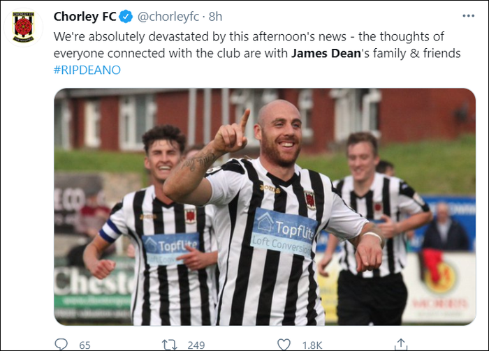 "Chúng tôi thực sự sốc trước sự ra đi đột ngột của James Dean. Toàn thể đội bóng xin gửi lời chia buồn đến gia đình và bạn bè của James. Hãy yên nghỉ nhé Deano", CLB Chorley FC thông báo tin buồn cho NHM.