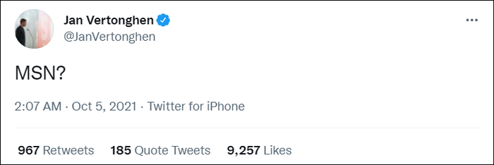 Cựu ngôi sao Tottenham, Jan Vertonghen, lại khiến dân tình phải đoán già đoán non khi đăng dòng trạng thái ngắn gọn: "MSN?" vào thời điểm các dịch vụ trực tuyến của Facebook đang gặp sự cố. Sau cùng, nhiều fan đoán rằng có thể anh chàng người Bỉ muốn gợi ý sử dụng nền tảng nhắn tin MSN - dịch vụ nhắn tin "cổ lỗ sĩ" từng được Microsoft phát triển - để liên lạc.