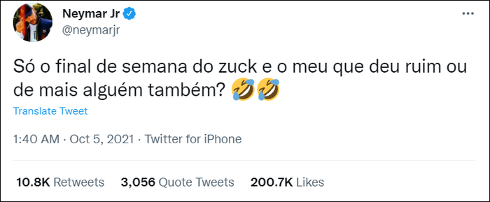 Trong đó, các ngôi sao bóng đá cũng bị "ảnh hưởng" nhất định. Neymar là một trong những người lên tiếng đầu tiên. "Chỉ có Zuck (Mark Zuckerburg) và tôi vừa trải qua kỳ cuối tuần tồi tệ, hay còn ai đó khác nữa không?", tiền đạo mới cùng PSG bất ngờ nhận thất bại 0-2 trước Rennes hài hước chia sẻ trên tài khoản Twitter.
