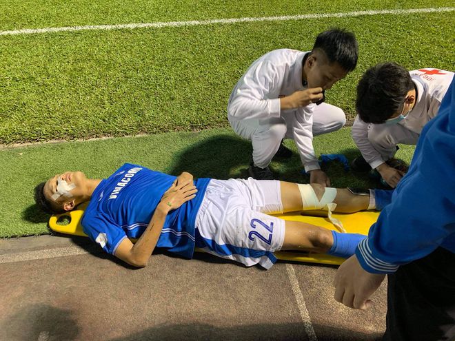 Các bác sĩ lập tức vào sân và bước đầu nhận định phần gần vùng mắt của Anh Việt bị chảy máu. Sau đó, ban tổ chức sân Cẩm Phả đã mở cửa phụ, và hậu vệ 21 tuổi đã được đưa đến bệnh viện bằng xe cứu thương được trưng dụng.