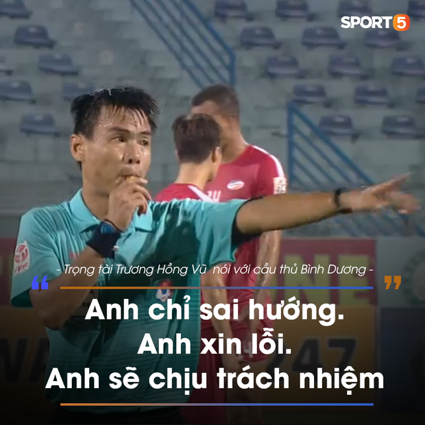 Chia sẻ trên Facebook cá nhân sau trận đấu, trung vệ Nguyễn Trọng Huy cho biết trọng tài Trương Hồng Vũ đã nhận sai ở tình huống phạm lỗi trước khi dẫn tới bàn thắng. Vị trọng tài này nói với các cầu thủ Bình Dương: "Anh chỉ sai hướng, anh xin lỗi. Anh sẽ chịu trách nhiệm".