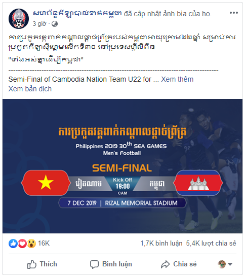 Chỉ sau khoảng 3 giờ đăng tải trên fanpage facebook, thông tin của LĐBĐ Campuchia đã nhận về hơn 16.000 lượt yêu thích, hơn 1.700 lượt bình luận và 5.000 lượt chia sẻ.