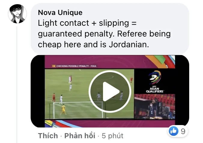 Một cổ động viên khác lại khẳng định: "Tiếp xúc nhẹ + trượt = chắc chắn có penalty. Trọng tài thật rẻ tiền và là người Jordan".