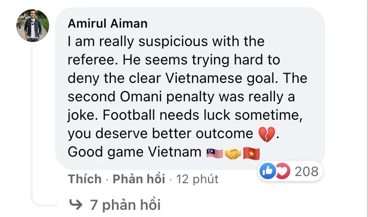 Trên fanpage ASEAN Football, nhiều CĐV Đông Nam Á đã để lại bình luận bức xúc về quyết định của trọng tài chính. Một cổ động viên có tài khoản là Amirul Aiman bình luận: "Tôi thực sự nghi ngờ với trọng tài trong trận đấu ngày hôm nay. Anh ta có vẻ rất cố gắng để có thể từ chối bàn thắng rõ ràng của ĐT Việt Nam. Ở quả phạt đền thứ 2 của Oman thực sự là một trò đùa. Bóng đá đôi khi cần may mắn, Việt Nam xứng đáng có được một kết quả tốt hơn. Các bạn đã có được một trận đấu tốt".