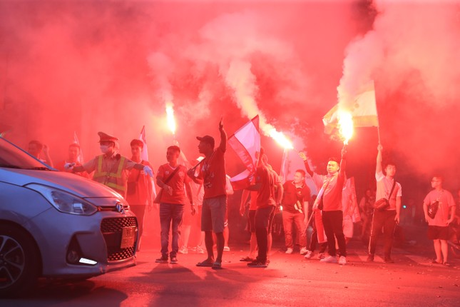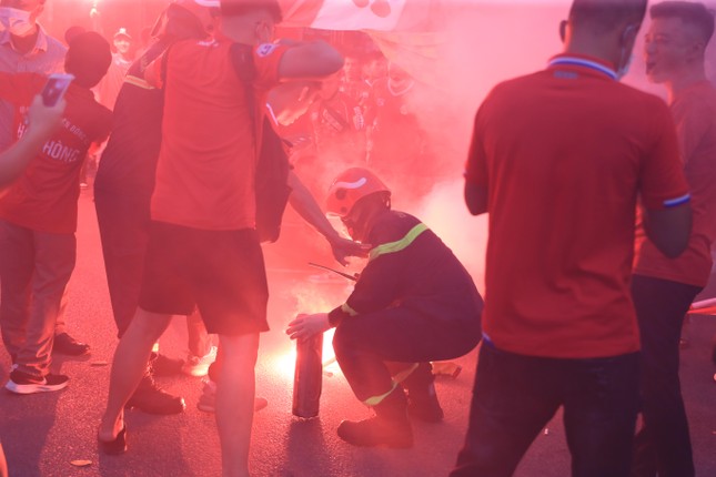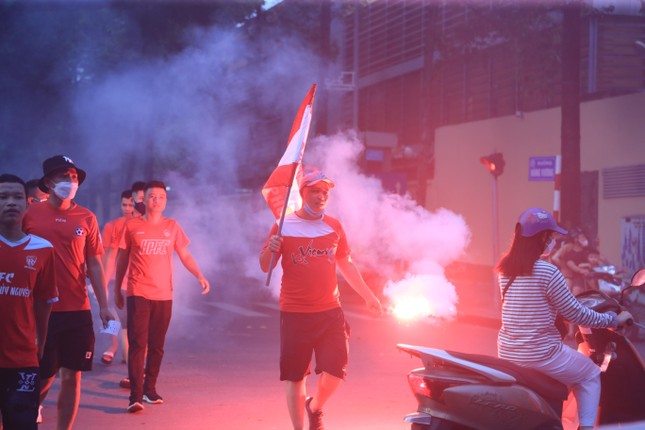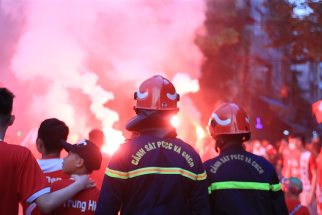 Gần giờ diễn ra trận đấu, CĐV Hải Phòng đua nhau đốt pháo sáng bên ngoài sân Hàng Đẫy, khu vực đường Nguyễn Thái Học và phố Hàng Cháo. Khói pháo mờ mịt cộng với việc tụ tập đông người đã gây ách tắc giao thông cục bộ. Các chiến sĩ phòng cháy chữa cháy cũng phải làm việc rất vất vả để dập lửa.