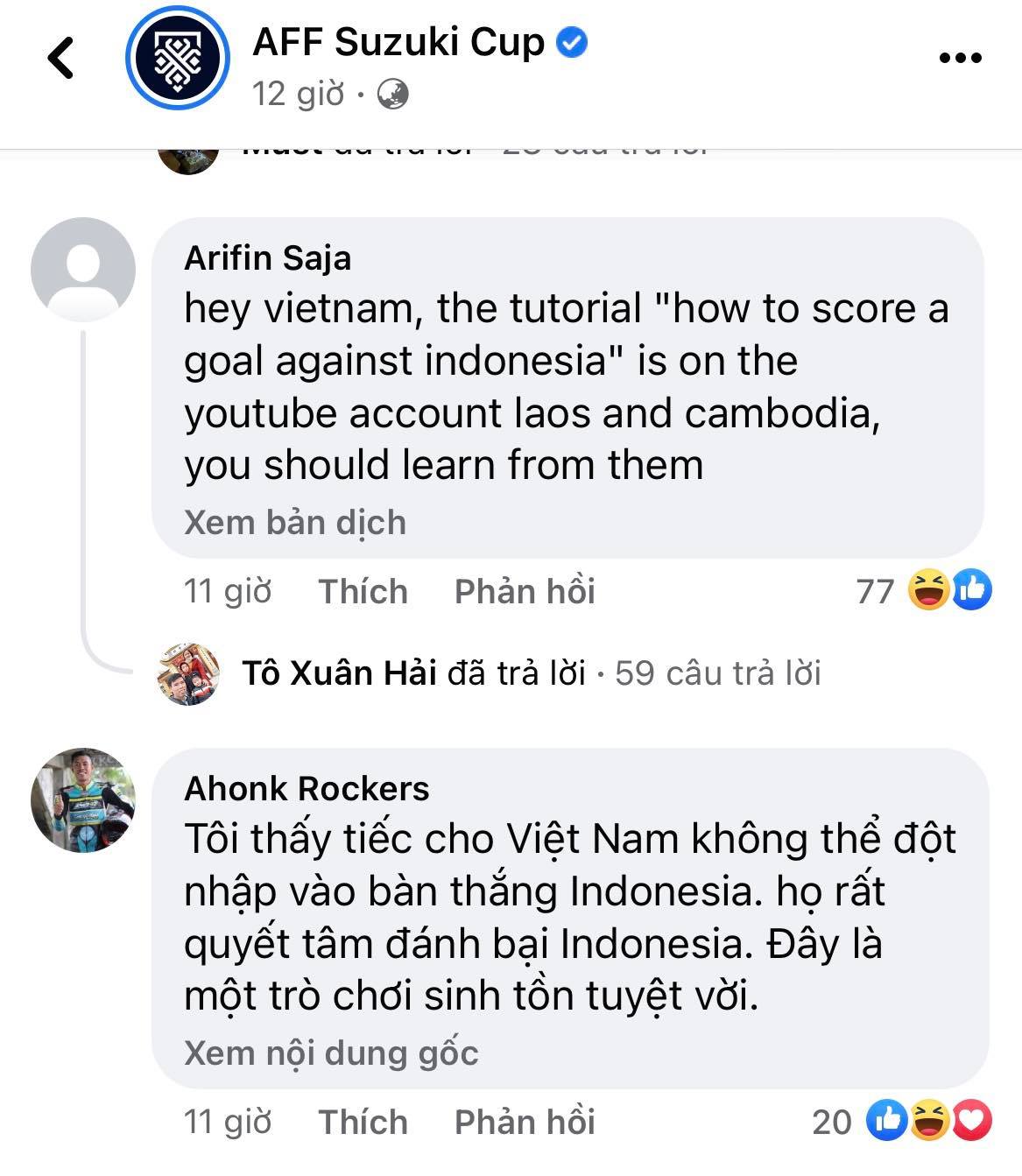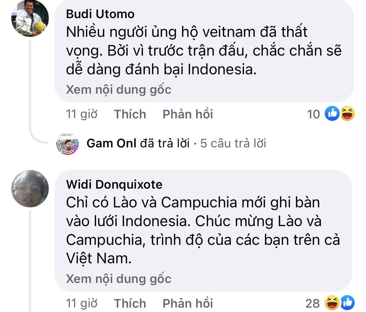 Trên trang chủ AFF Cup 2020, nhiều fan Indonesia đã vào chế giễu ĐT Việt Nam. CĐV Arifin Saja bình luận: “Việt Nam ơi, bài hướng dẫn cách ghi bàn vào lưới Indonesia có trên tài khoản youtube của Lào và Campuchia. Các bạn nên học hỏi từ họ”. Một bình luận gần tương tự cũng được CĐV Widi Donquixote viết: “Chỉ có Lào và Campuchia mới ghi bàn vào lưới Indonesia. Chúc mừng Lào và Campuchia, trình độ của các bạn trên cả Việt Nam”.