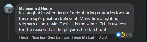 CĐV Muhammad Hazim bực tức: "Thật đáng cười khi người hâm mộ các nước láng giềng nhìn vào bảng đấu này và tin tưởng vào vị trí hiện tại. Rất nhiều lần đối đầu với ĐT Việt Nam mà không thể chiến thắng. Chiến thuật giữ nguyên. Tan Cheng Hoe thật vô dụng với lý do rằng các cầu thủ mệt mỏi. Sa thải Tan Cheng Hoe đi (TCH Out - PV)".
