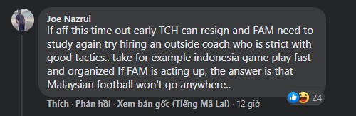 Tài khoản Joe Nazrul bày tỏ: "Thời điểm đầu của AFF Cup là lúc Tan Cheng Hoe có thể từ chức và FAN cần phải xem lại công tác tuyển dụng, cân nhắc thuê một HLV nước ngoài với một chiến thuật tốt hơn. Lấy ví dụ như Indonesia, họ đã bóng nhanh và có tổ chức hơn. Nếu FAM không hành động ngay, bóng đá Malaysia sẽ chẳng đi đến đâu cả..."