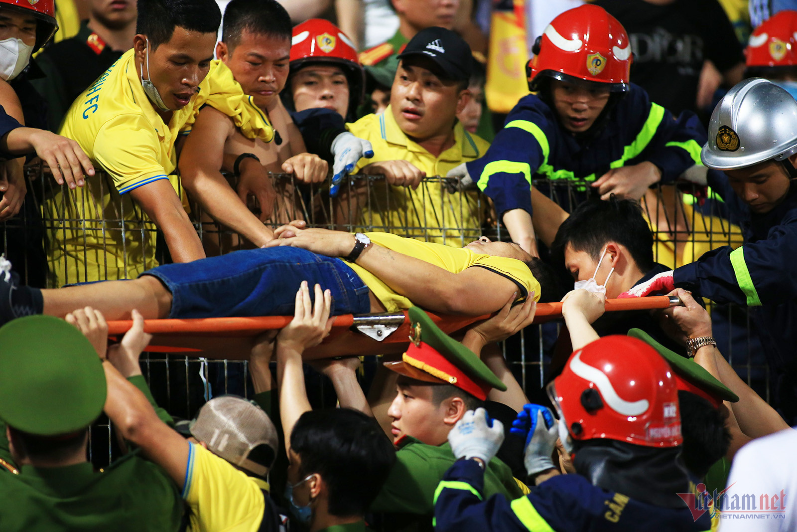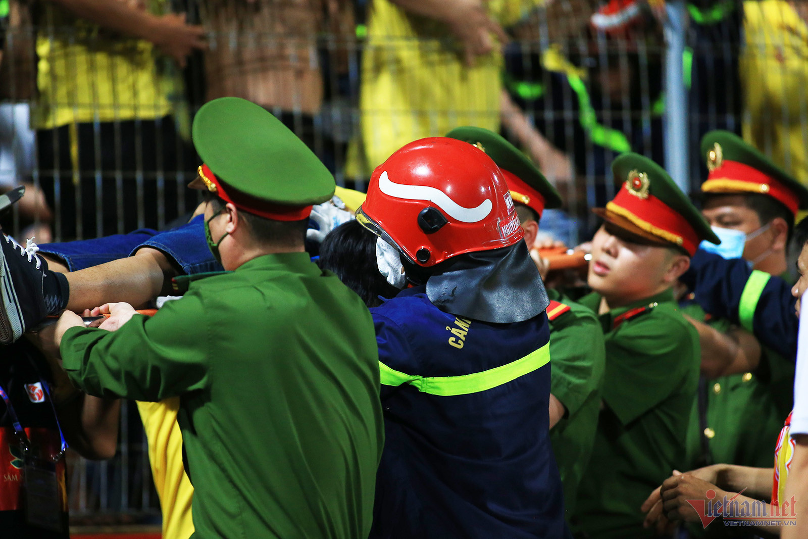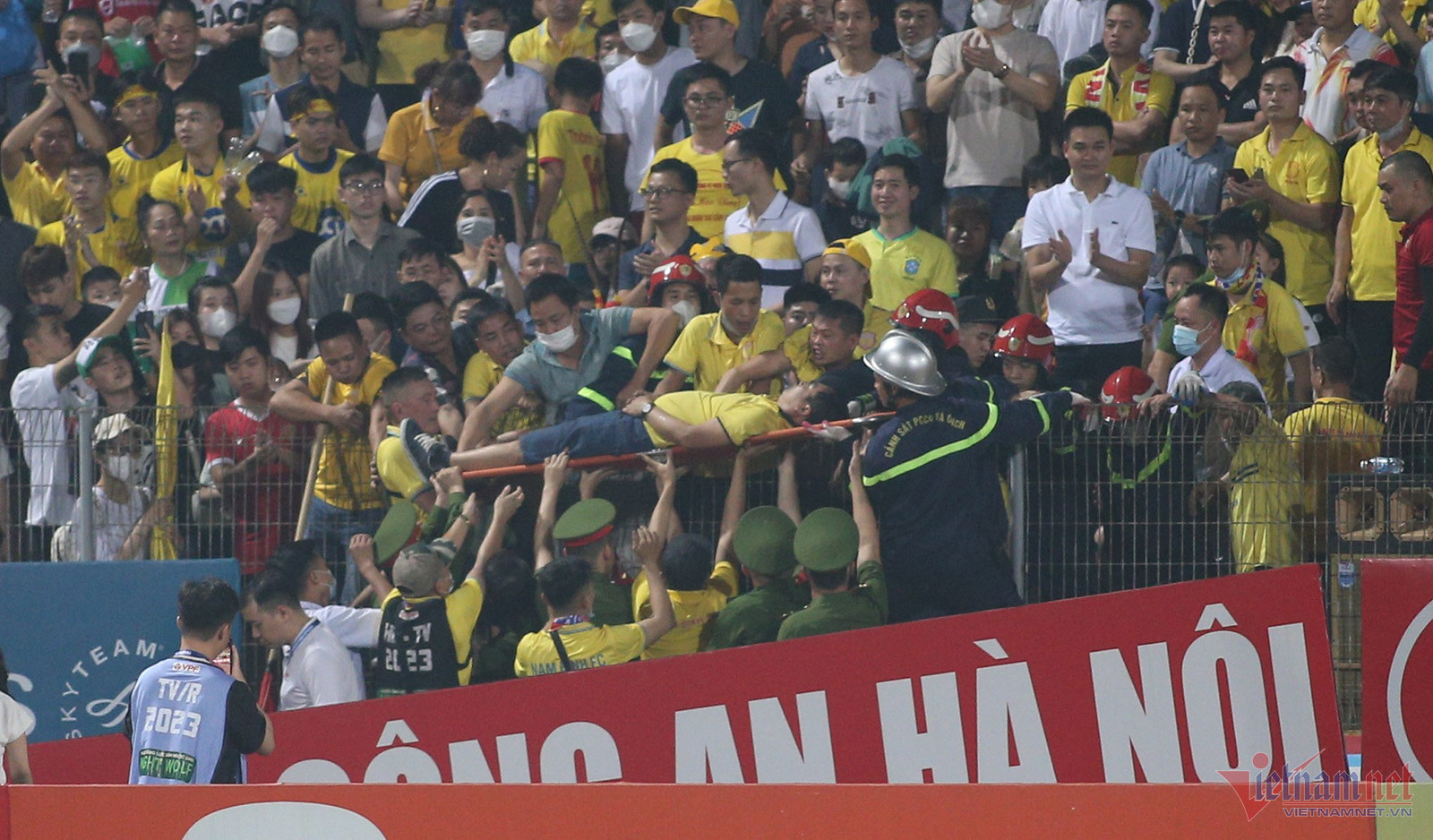 Lực lượng an ninh và y tế sân Hàng Đẫy giải cứu một CĐV Nam Định bị ngạt thở trên khán đài, trước thời điểm diễn ra trận đấu giữa CAHN vs Nam Định, vòng 7 V-League 2023.