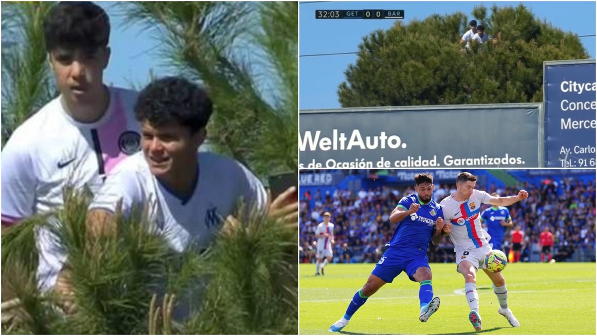 Ba chàng trai trẻ tuổi bất ngờ tạo nên điểm nhấn nổi bật nhất trong trận Getafe 0-0 Barca, khi leo lên ngọn cây bên cạnh sân vận động Coliseum Alfonso Perez để “xem ké” màn so tài ở vòng 29 La Liga. Trong nhóm này, một người mặc áo đấu PSG, một người mặc áo đấu Marseille và một người chỉ lộ mặt cùng chiếc điện thoại khỏi bụi cây.