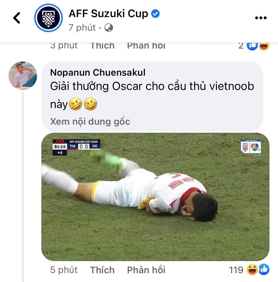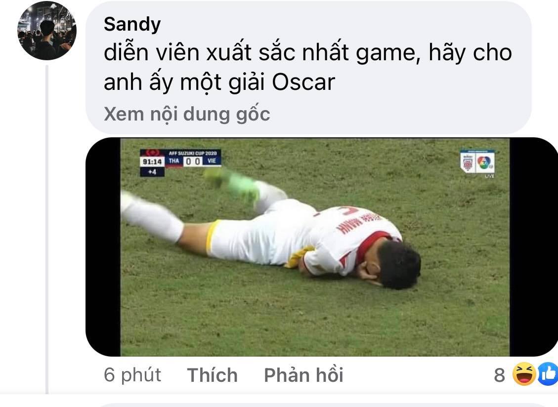 Khi trận đấu khép lại, tình huống này cũng nhận được sự quan tâm của CĐV Thái Lan. Trên trang chủ AFF Cup, đông đảo NHM xứ chùa Vàng đã có những chia sẻ đầy “mỉa mai” dành cho hậu vệ của ĐT Việt Nam. “Giải thưởng Oscar dành cho cầu thủ Việt Nam này”, tài khoản Nopanun Chuensakul bình luận. Trong khi đó, một CĐV khác bày tỏ: “Diễn viên xuất sắc nhất trận đấu. Hãy cho anh ấy giải Oscar”. Một tài khoản khác đến từ xứ chùa Vàng có tên Jone Yoyuji bình luận: “K-drama phải thuê cầu thủ Việt Nam này đóng trong bộ phim tiếp theo. Màn trình diễn của anh ấy rất tốt”.