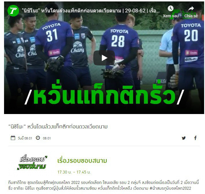 Một tuần trước thời điểm tuyển Thái Lan tiếp đón Việt Nam ở lượt trận khai màn vòng loại World Cup, tờ Thairath sáng 29/8 đã đăng tải clip về buổi tập luyện của thầy trò HLV Akira Nishino. Đáng chú ý, tờ báo này đặt nhan đề: "Tuyển Thái Lan e sợ trước thềm đại chiến gặp Việt Nam".