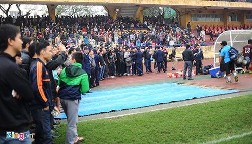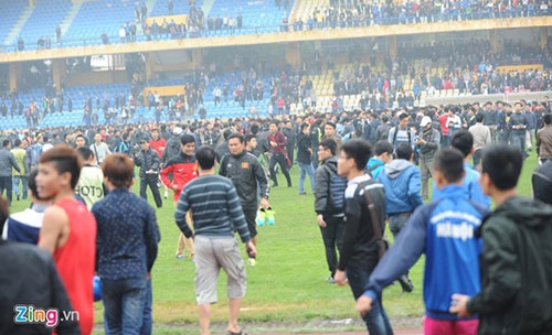 Sân Hàng Đẫy mất trật tự khi CĐV tràn xuống sân. Lực lượng an ninh bất lực trước sự quá khích của khán giả. |
