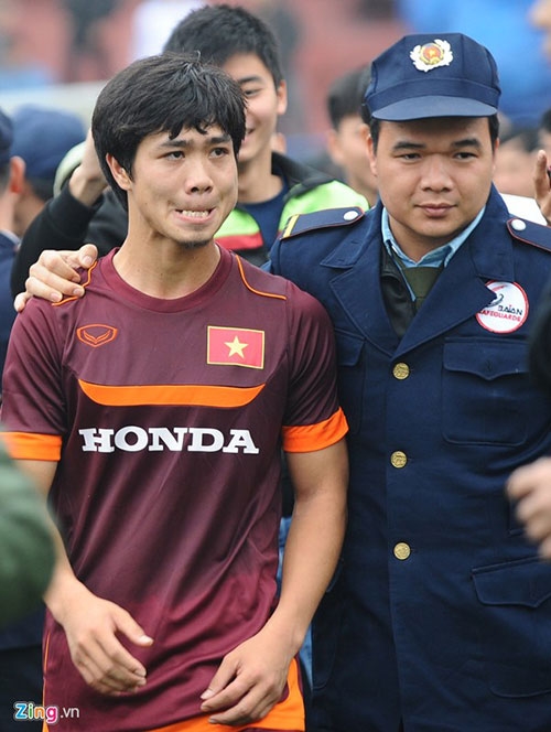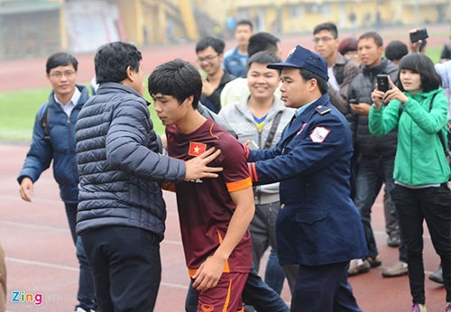 Công Phượng vào sân ở hiệp 2 trong trận giao hữu giữa Olympic Việt Nam với Hà Nội T&T. Anh ghi bàn ấn định chiến thắng 3-1 cho Olympic Việt Nam. Sau trận đấu, Công Phượng phải rời sân với sự giúp đỡ của lực lượng an ninh sân Hàng Đẫy. |