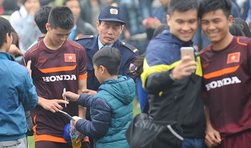 Văn Toàn từ chối chụp hình cùng một CĐV. Anh là một trong những cầu thủ của Olympic Việt Nam nhận được nhiều sự quan tâm của người hâm mộ. |