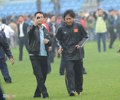 HLV Miura sau khi kết thúc buổi họp báo cuối trận cũng phải chạy trốn người hâm mộ khi họ xin chụp ảnh cùng. |