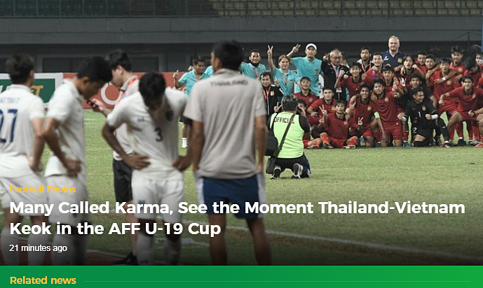 Tương tự, hàng loạt báo Indonesia đưa từ "quả báo" lên tiêu đề khi tường thuật hai trận bán kết U19 Đông Nam Á, nơi Việt Nam và Thái Lan đều thua, gồm Tribun News, Bolasport, Sindo News, 1News, Detik, Suara, Okezone, Sportstar, NBC News, Viva hay Bola.