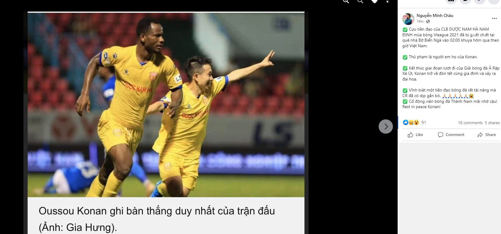 "Vĩnh biệt một tiền đạo bóng đá rất tài năng mà CR đã có dịp gắn bó. Cổ động viên bóng đá Thành Nam mãi nhớ cậu! Rest in peace Konan", người đại diện Nguyễn Minh Châu bày tỏ.