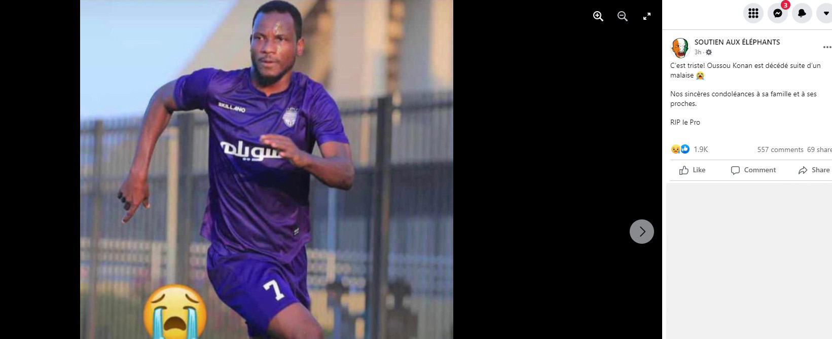 Người đại diện Nguyễn Minh Châu chia sẻ lên Facebook thông tin rằng, Oussou Konan đã bị sát hại và qua đời tại quê nhà Bờ Biển Ngà vào lúc 2h00 rạng sáng ngày 4/1, theo giờ Việt Nam.