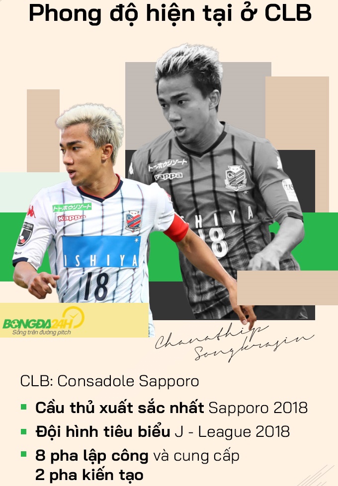 Chanathip hiện tại đang có phong độ thi đấu rất cao tại CLB Consadole Sapporo. Cách đây chưa lâu, ngôi sao được mệnh danh là 'Messi Thái' đã hai lần điền tên lên bảng tỷ số khi Consadole Sapporo có trận thắng hủy diệt 8-0 trước Shimizu S-Pulse ở giải J-League 1. Ở trận này, tiền vệ người Thái còn có 2 đường kiến tạo để các đồng đội lập công.