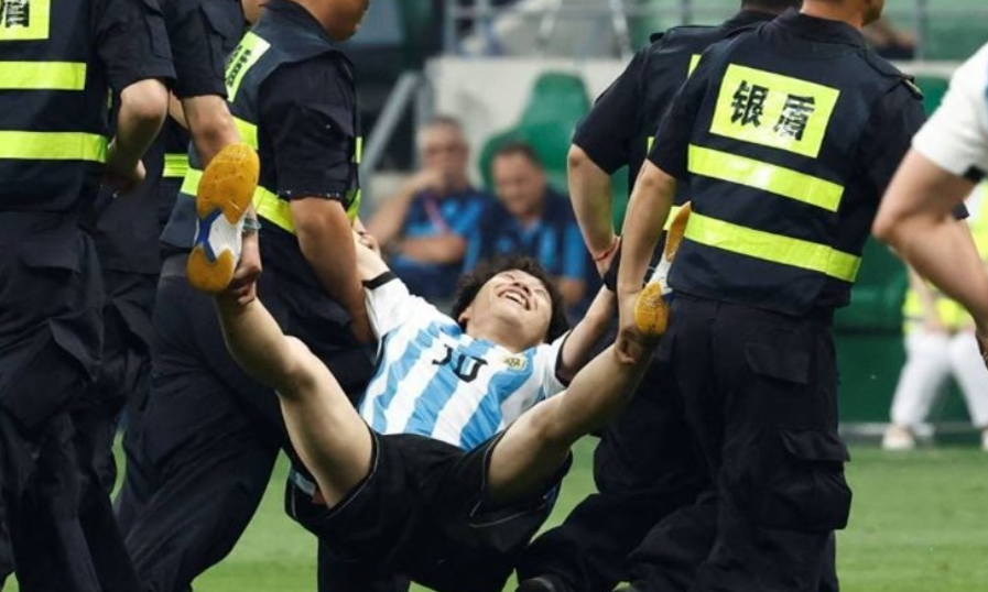 Hành động của fan cuồng này đã ảnh hưởng đến việc thi đấu của hai đội. Sau đó, nam thanh niên bị một nhóm lực lượng an ninh khiêng ra bên ngoài. Trong một bức hình có thể thấy, dù bị đưa ra khỏi sân, CĐV mặc áo đấu số 10 của Messi vẫn nở nụ cười rạng rỡ.