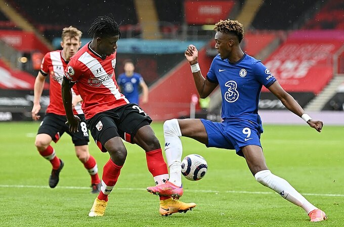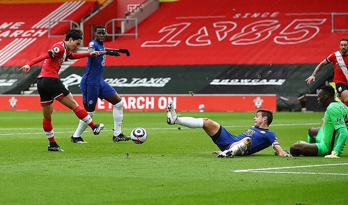 Trong thế trận đều đều, với ít điểm nhấn ở hai đầu khung thành, Ralph Hasenhuttl phần nào sắc sảo hơn HLV đồng hương. Phút 33, tấm lá chắn phòng ngự từ xa của Chelsea bị Nathan Redmond xuyên thủng bằng đường chọc khe dọc trung lộ. Mateo Kovacic dâng quá cao, và để ba hậu vệ áo xanh đối đầu với ba mũi tấn công chủ nhà. Takumi Minamino nhận bóng giữa Cesar Azpilicueta và Kurt Zouma, xâm nhập cấm địa, bình tĩnh làm động tác giả, trước khi nhẹ nhàng đưa bóng vào lưới khi thủ thành Edouard Mendy băng ra lỡ trớn.