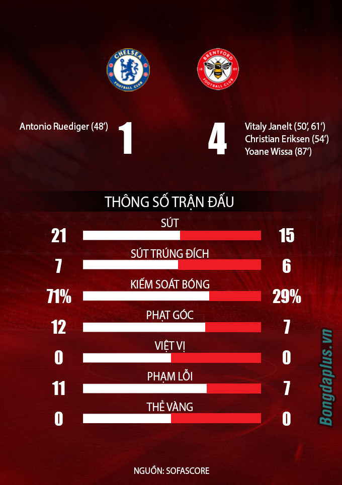 Kịch tính được đẩy lên cao khi Chelsea tiếp tục phải nhận bàn thua thứ 2 ở phút 54. Lần này tiền vệ tân binh Eriksen của Brentford là người chạm bóng cuối cùng với cú dứt điểm tinh tế cũng bằng chân trái. Đáng chú ý, đây là pha lập công thứ 3 của Eriksen trong 3 trận đấu gần đây, một con số rất ấn tượng.