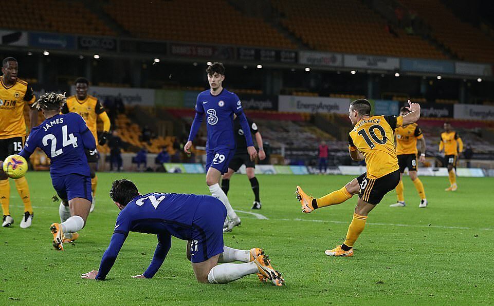 Màn ngược dòng của Wolves bắt đầu chỉ sáu phút sau bàn thua. Fabio Silva sút cận thành, tung lưới Edouard Mendy nhưng bị thổi phạt việt vị. Không nản chí, đội chủ nhà tiếp tục duy trì sức ép và gỡ hòa ở phút 65. Daniel Podence bình tĩnh ngoặt bóng qua cả Chilwell lẫn Reece James, trước khi sút bóng về góc gần. Bóng đập chân James, đổi hướng, khiến Mendy không kịp trở tay.