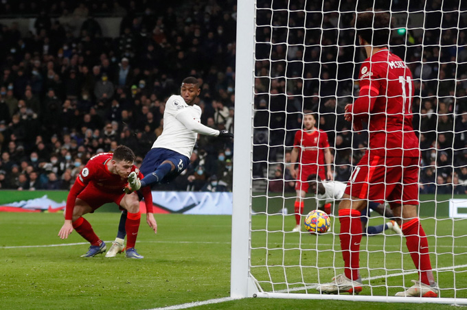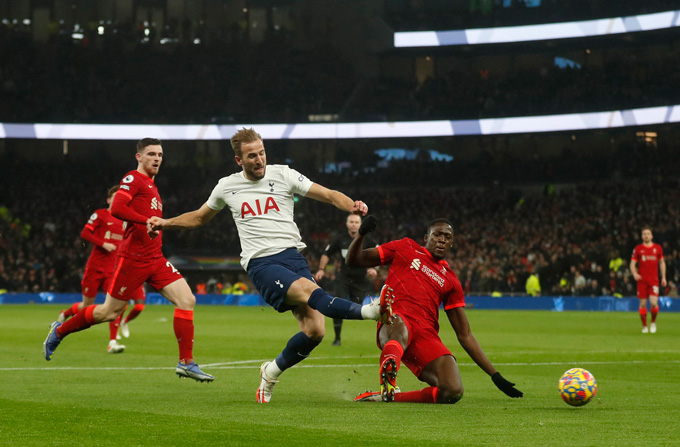 Tottenham đoạt lại bóng ở giữa sân. Ndombele tung ra đường chọc khe hoàn hảo để Kane phá bẫy việt vị thoát xuống. Bất chấp sự truy cản quyết liệt của Konate, tiền đạo của Tottenham vẫn tung ra được pha dứt điểm hiểm hóc vào góc xa đánh bại Alisson.