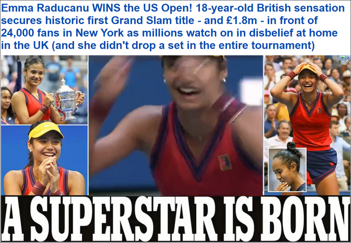 12/09/2021 17:20Chiếm spotlight của Ronaldo, nữ tay vợt tuổi teen Raducanu khiến fan và truyền thông Anh phát cuồng khi vô địch US Open