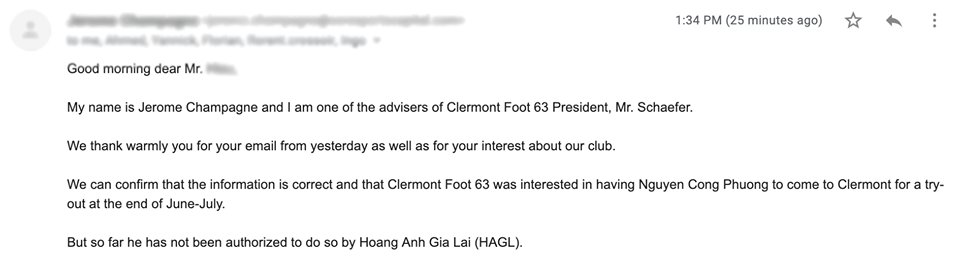 Nội dung bức thư như sau: "Chào các bạn! Tên tôi là Jerome Champagne và một trong những cố vấn của Chủ tịch câu lạc bộ Clermont Foot 63, ông Schaefer. Chúng tôi cảm ơn bạn rất nhiều vì email của bạn gửi ngày hôm qua cũng như sự quan tâm mà bạn dành cho câu lạc bộ của chúng tôi".