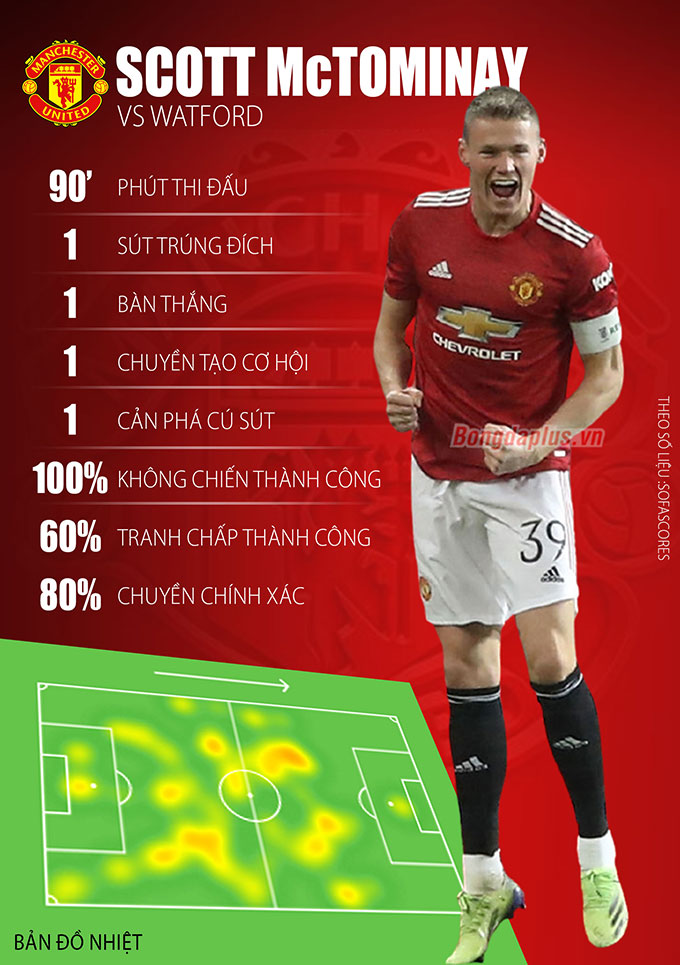 Ở trận đấu nói trên giữa M.U và Watford, McTominay đã tạo ra bước ngoặt từ rất sớm. Ngay phút thứ 5, anh đã thực hiện cú đánh đầu đập đất sau quả tạt từ cánh trái của Alex Telles mang về thắng lợi tối thiểu cho đội chủ sân Old Trafford.