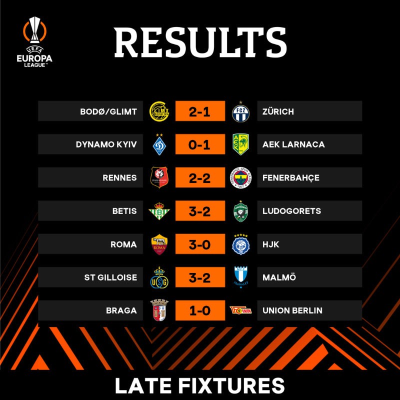 Ở một số cặp đấu đáng chú ý khác, Lazio của HLV Maurizio Sarri đã phải chuốc lấy thảm bại 1-5 trên sân khách trước Midtjylland, Sociedad vượt qua Omonia 2-1, Monaco thua Ferencvaros 0-1, Betis hạ Ludogorets 3-2 hay Sporting Braga giành chiến thắng 1-0 trước Union Berlin.