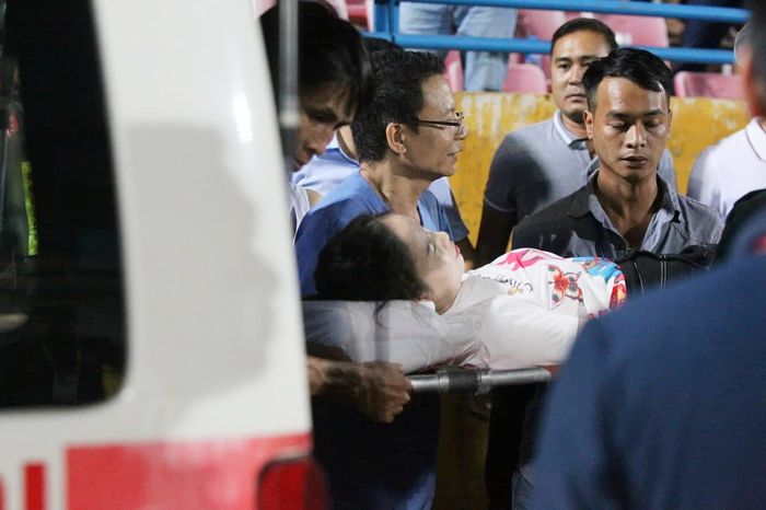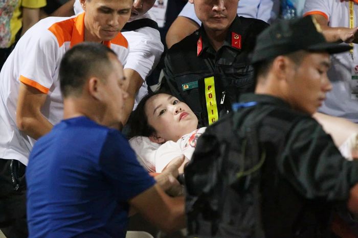 Hiện nữ cổ động viên đang được điều trị tại khoa Bỏng (Bệnh viện Xanh Pôn). Theo bác sĩ, hiện tình trạng bệnh nhân ổn định, chấn thương phần mềm, không có tổn thương xương, không có tổn thương mạch máu… Bệnh nhân có tổn thương mặt ngoài đùi trái với kích thước 15-30 cm. Vết thương của bệnh nhân không phải do bỏng mà do công phá từ sức nổ của pháo. Với vết thương do hỏa khí việc điều trị rất khó khăn, nếu bệnh nhân đề kháng kém thì việc điều trị sẽ rất lâu dài.