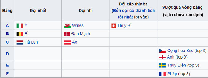 Như vậy, tổng cộng đã có 11 đội bóng chính thức có vé vào vòng 1/8 EURO 2020. Đó là Italia, Bỉ, Hà Lan, Xứ Wales, Đan Mạch, Áo, Thụy Sỹ, Anh, CH Czech, Thụy Điển và Pháp.
