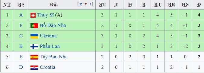 Đó là Italia, Xứ Wales và Thụy Sỹ ở bảng A. Tại bảng này, Thụy Sỹ có vé đi tiếp nhờ thành tích là đội thứ 3 có thành tích tốt nhất. Hiện họ đang đứng đầu bảng xếp hạng các đội xếp thứ ba tại vòng bảng EURO 2020 với 4 điểm.