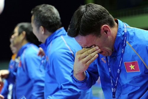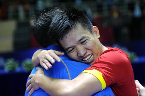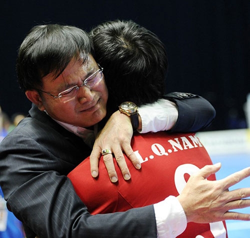 | Ở một góc sân, ông Trần Anh Tú - Trưởng đoàn futsal Việt Nam không cầm được nước mắt, ôm chầm lấy cầu thủ Lê Quốc Nam. |