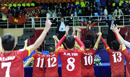 | Toàn đội futsal Việt Nam chạy tới khán đài cảm ơn sự cổ vũ nhiệt tình của những cổ động viên áo đỏ trên đất khách. |
