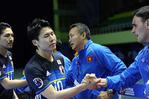 | Ban huấn luyện ĐT Việt Nam bắt tay các cầu thủ futsal Nhật Bản, khi họ đã chính thức bị loại và trở thành cựu vương của giải đấu, sau khi để thua Việt Nam 1-2 ở loạt luân lưu (trước đó hòa 4-4 sau 2 hiệp phụ). |