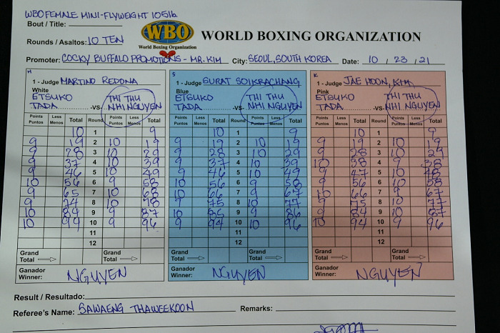 Tuy nhiên, Tada đã có nửa đầu trận đấu chơi không tốt và phải trải qua một vài hiệp đấu khó khăn. Do đó, cả 3 giám định chấm 96-94 cho Thu Nhi là có thể hiểu được.