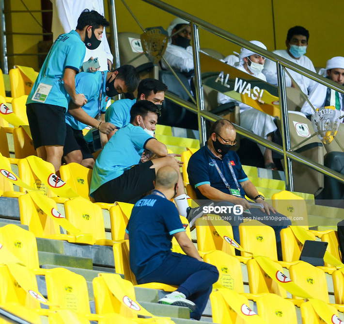 Nhóm cầu thủ đá chính vừa đi vào phòng thay đồ nghỉ ngơi, nhóm dự bị vào sân làm nóng thì trên khán đài vang lên tiếng động. Bùi Hoàng Việt Anh, Lý Công Hoàng Anh, Nguyễn Hai Long, Hồ Tấn Tài reo lên ăn mừng khi Harry Souttar ghi bàn cho Australia. Hoàng Anh vỗ tay, Hai Long thì giơ tay cao báo hiệu cho đồng đội ở phía dưới. Tiền vệ Tuấn Anh ngồi ở góc khác cũng tiến tới cập nhật tình hình. Người duy nhất không biểu lộ cảm xúc quá mức là HLV Park Hang-seo, ông ngửa người nhẹ ra phía sau trước khi đứng lên và ra một góc khác không ai thấy.