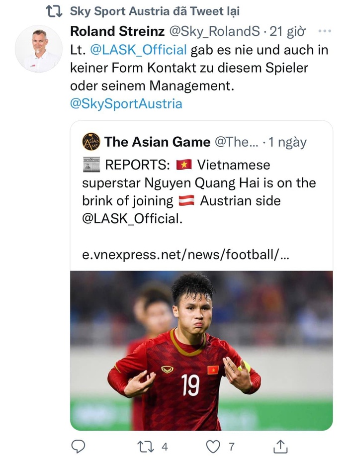 Ngay sau đó, đến lượt Sky Sports phiên bản Áo đã chia sẻ thông tin này của cây bút Roland Streinz trên Twitter. Điều đó có nghĩa là Sky Sports phiên bản Áo đã phủ nhận thông tin Quang Hải sẽ đến CLB LASK.