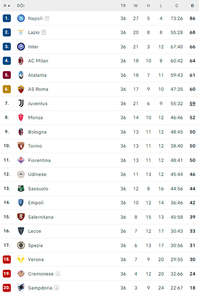 Nhưng tình thế thay đổi chóng mặt khi "Lão bà" nhận án phạt trừ 10 điểm từ Tòa phúc thẩm LĐBD Italy (FIGC) hôm qua. Theo đó, Juventus tụt xuống thứ bảy với 59 điểm.