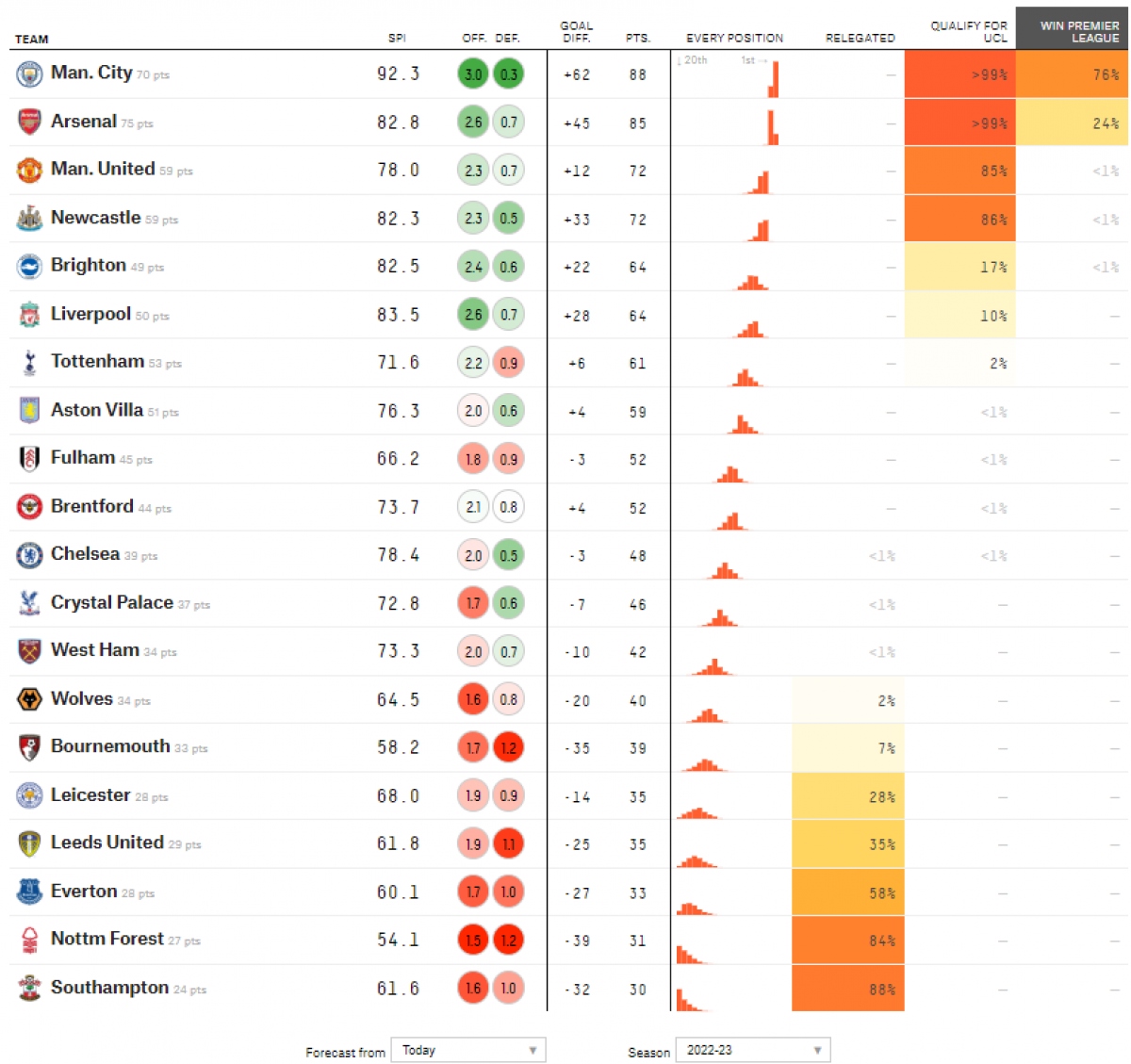 Cũng theo dự đoán của Fivethirtyeight, cơ hội vô địch Ngoại hạng Anh 2022/2023 với Man City tăng lên tới 76%. Trong khi cơ hội vô địch của Arsenal giảm xuống chỉ còn 24% sau trận hòa tai hại trước Southampton ở vòng đấu 32.