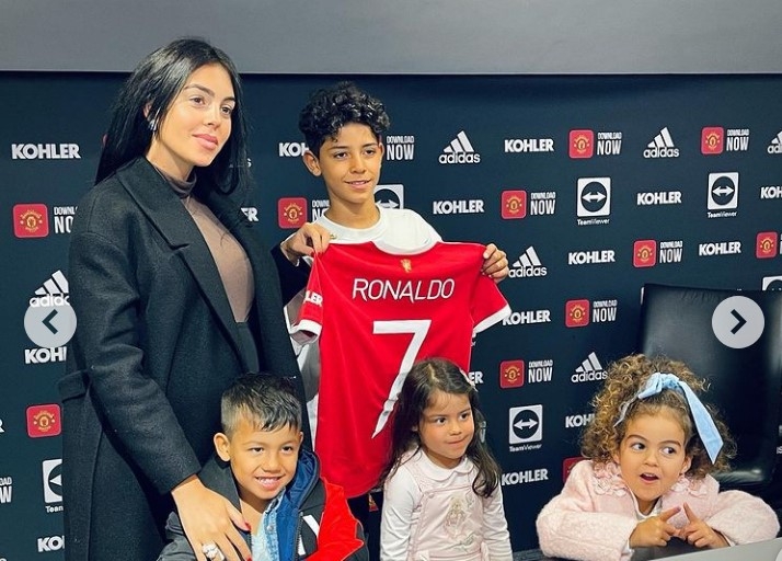 Trên mạng xã hội, bạn gái Georgina Rodriguez của Ronaldo cũng đăng tải hình ảnh Ronaldo Junior cầm trên tay chiếc áo của Quỷ đỏ kèm lời nhắn: "Hãy cùng nhau theo đuổi ước mơ. Mẹ Yêu Con", Georgina Rodriguez viết.