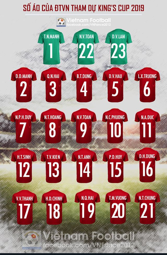 Còn lại, những cầu thủ khác vẫn chọn cho mình số áo quen thuộc như: Đặng Văn Lâm (số 23), Quế Ngọc Hải (số 3), Bùi Tiến Dũng (số 4), Văn Thanh (số 17), Xuân Trường (số 6), Hùng Dũng (số 16), Anh Đức (số 11).