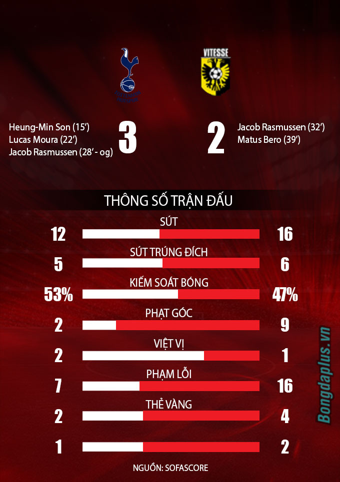 Tottenham: Son (15'), Moura (22'), Rasmussen (phản lưới 28')
