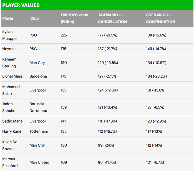Nghiên cứu của KPMG cho biết nếu mùa giải bóng đá châu Âu không thể kết thúc theo dự kiến, tổng giá trị cầu thủ châu Âu sẽ sụt giảm 8,7 tỷ bảng Anh (9,4 tỷ euro). Trong trường hợp các giải đấu phải diễn ra trong những sân vận động không có khán giả, giá trị mất đi sẽ thấp hơn nhưng vẫn là con số khổng lồ: 6 tỷ bảng Anh (6,54 tỷ euro).