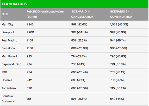 Man City và Liverpool, hai đội dẫn đầu Ngoại hạng Anh, cùng với hai đại gia Tây Ban Nha là Real Madrid và Barcelona chịu ảnh hưởng nặng nhất về giá trị đội hình. Hồi tháng 2, giá trị đội hình của Liverpool là 1,2 tỷ euro nhưng sẽ giảm xuống còn 907 triệu euro nếu giải Ngoại hạng Anh bị hủy. Con số ứng với trường hợp đá sân không khán giả là 997 triệu euro.
