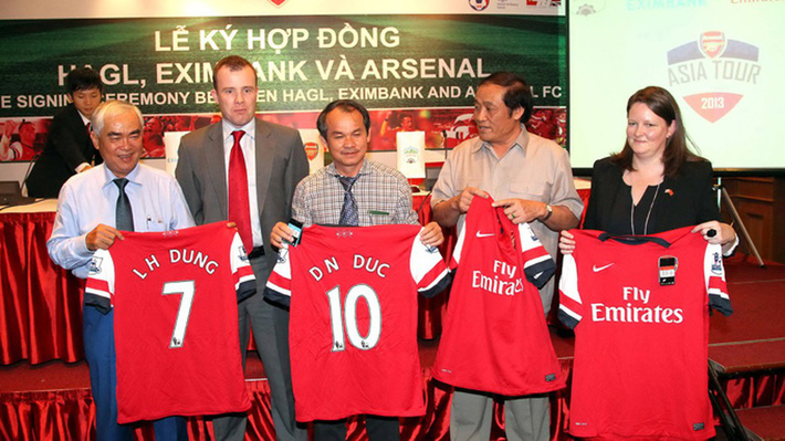 04h20 sáng ngày 15/7/2013, máy bay chở 80 thành viên của Arsenal hạ cánh xuống sân bay Nội Bài. HLV Wenger cùng các siêu sao nổi nhất của Pháo thủ đều đến Việt Nam du đấu. Khi được hỏi về mức phí mà bầu Đức và ngân hàng Eximbank chi ra để mời CLB xứ Sương mù, ông Lê Hùng Dũng từ chối trả lời: